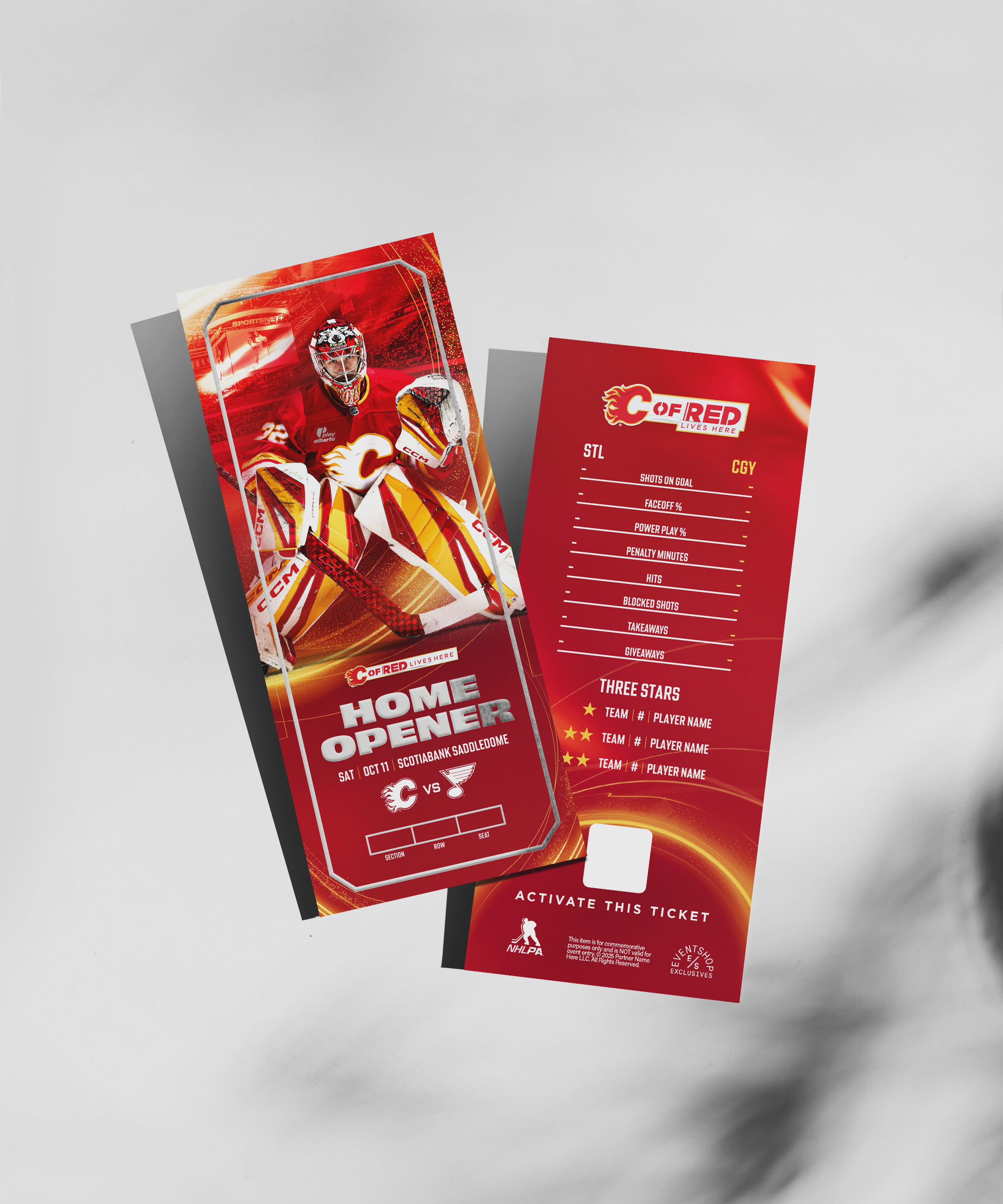 This commemorative ticket features the section, row and seat of your original ticket. Commemorating your Calgary Flames experience.