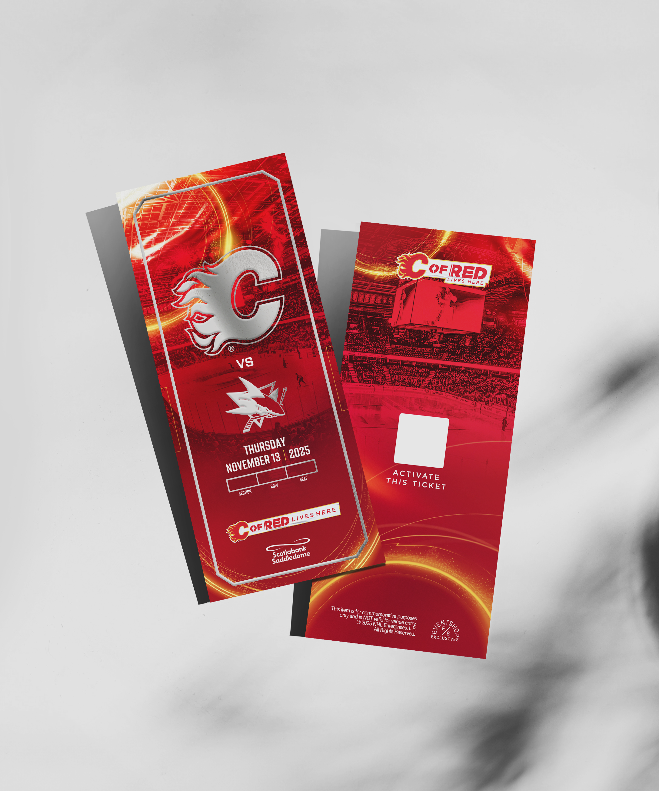 This commemorative ticket features the section, row and seat of your original ticket. Commemorating your Calgary Flames experience.