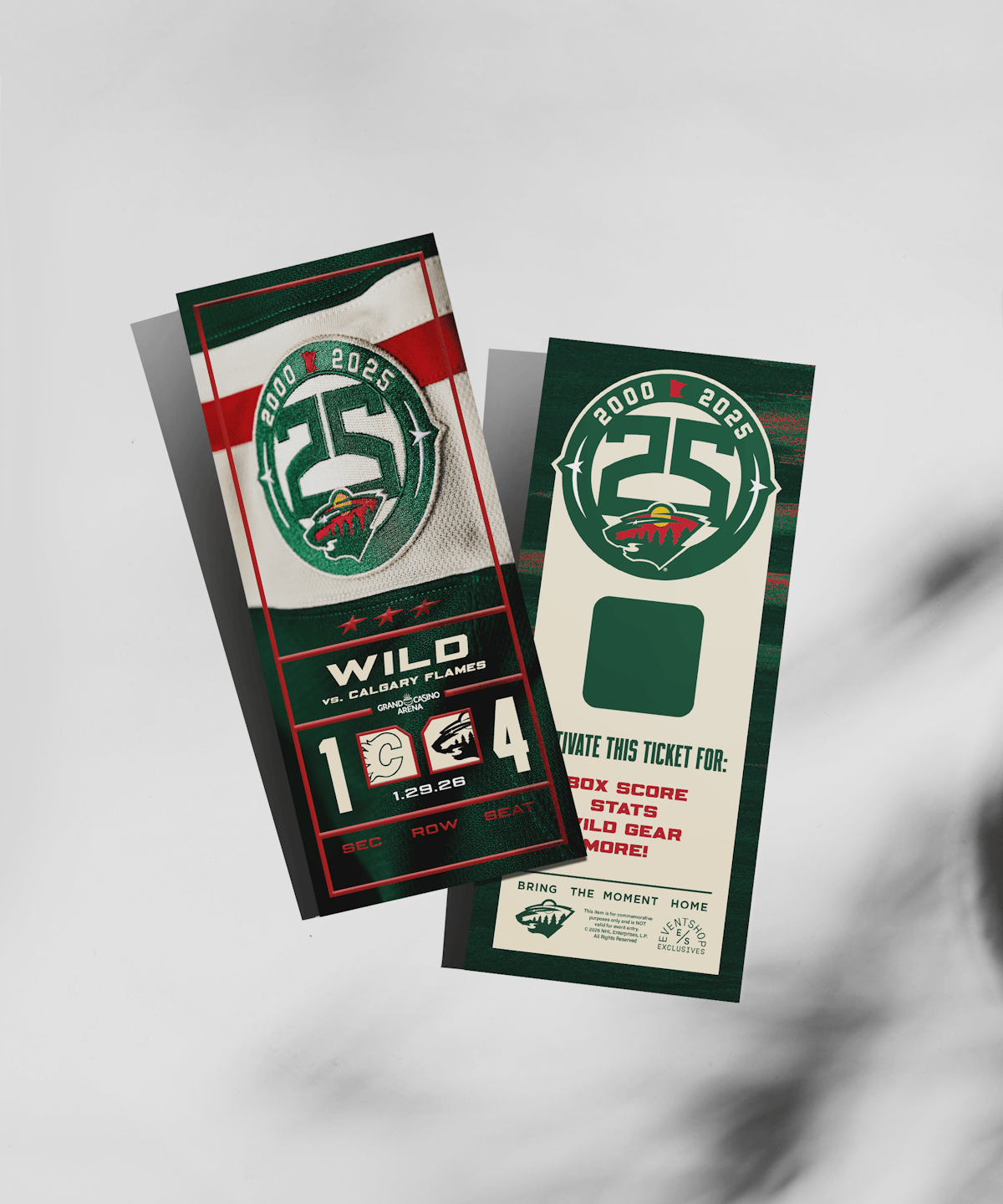 This commemorative ticket features the section, row and seat of your original ticket. Commemorating your Minnesota Wild experience.