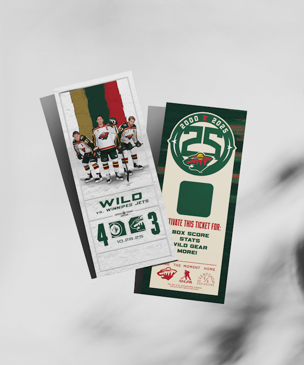 This commemorative ticket features the section, row and seat of your original ticket. Commemorating your Minnesota Wild experience.