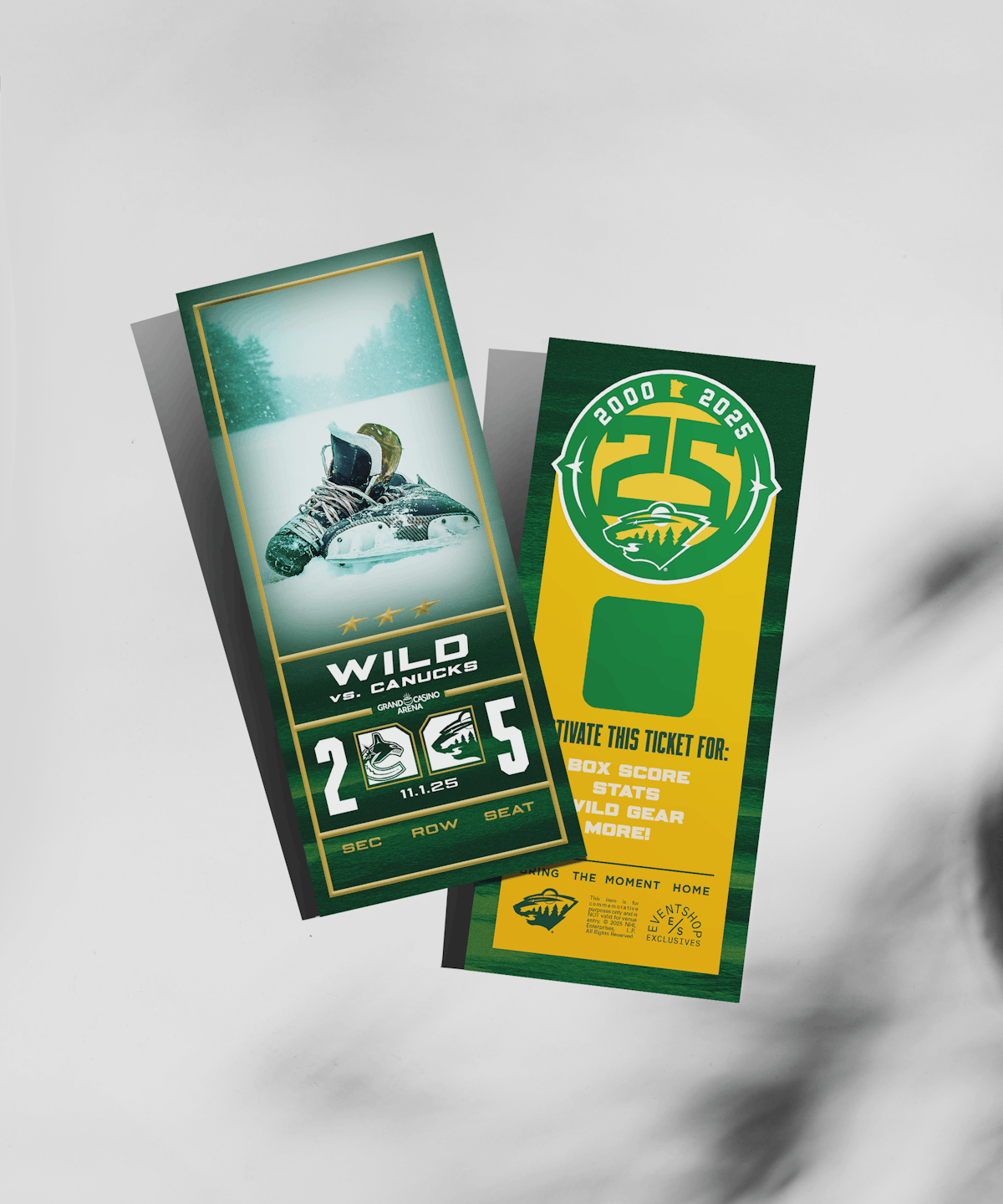 This commemorative ticket features the section, row and seat of your original ticket. Commemorating your Minnesota Wild experience.