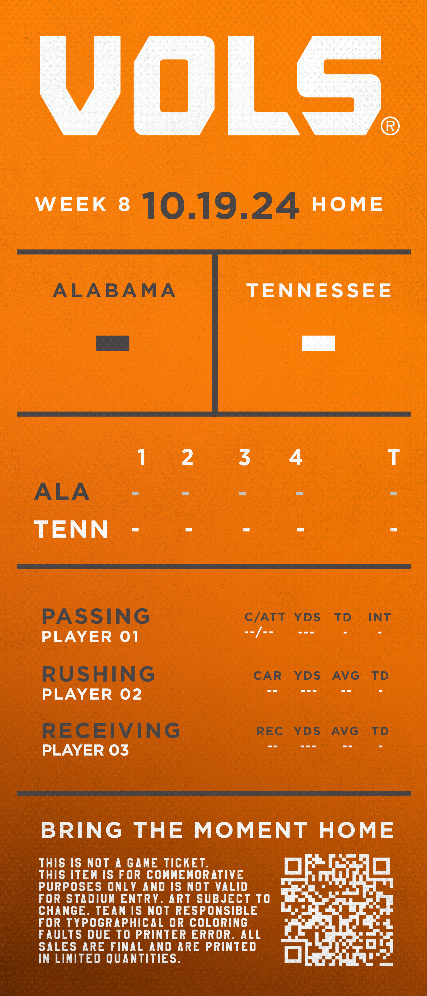 Commemorate Tennessee Volunteers vs Alabama Crimson Tide with this official collectible ticket. Featuring the section, row and seat of your original ticket.