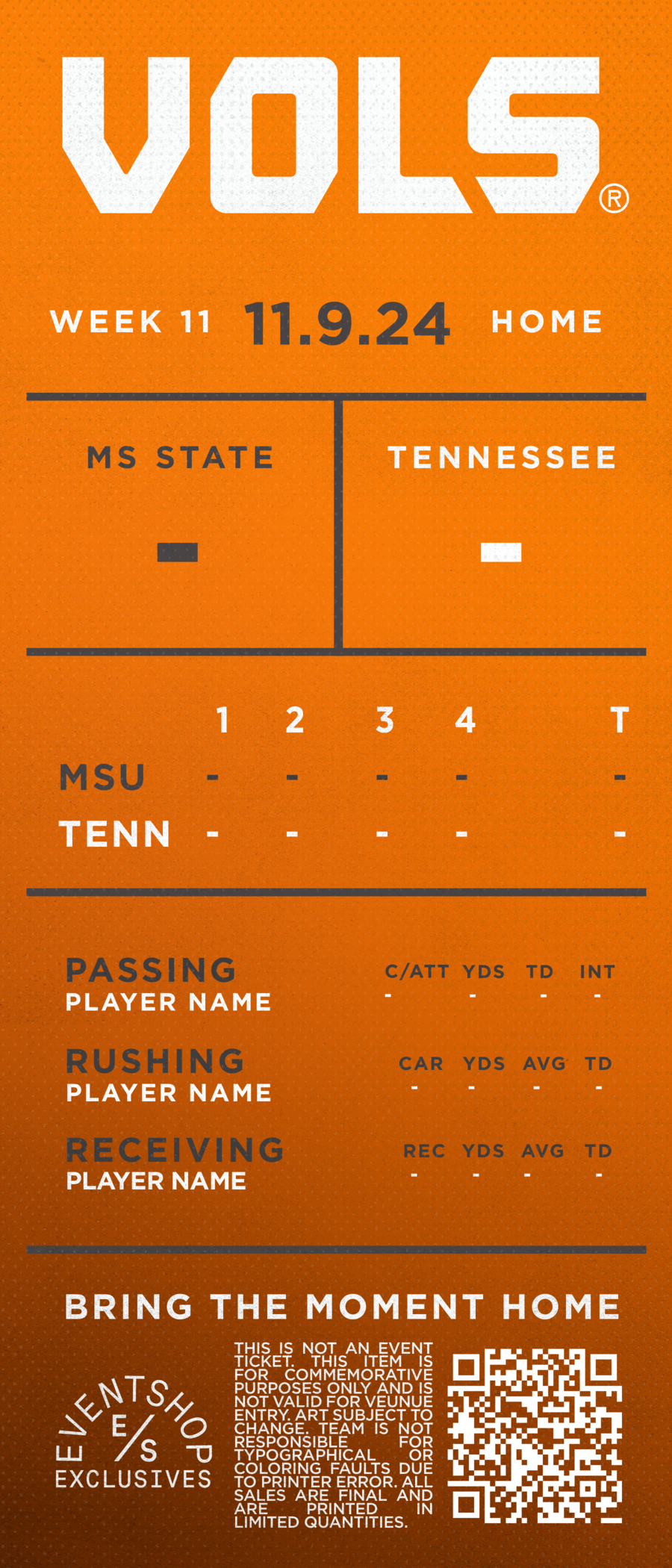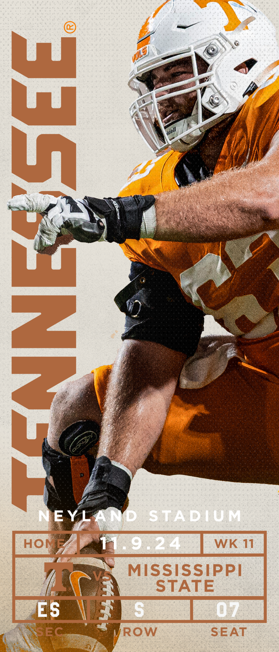 This commemorative ticket features the section, row and seat of your original ticket. Commemorating your Tennessee Football experience.